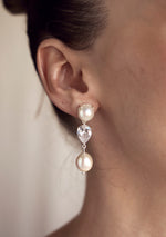 A pair of silver bridal earrings featuring freshwater pearls and pear-shaped cubic zirconia in a claw setting.